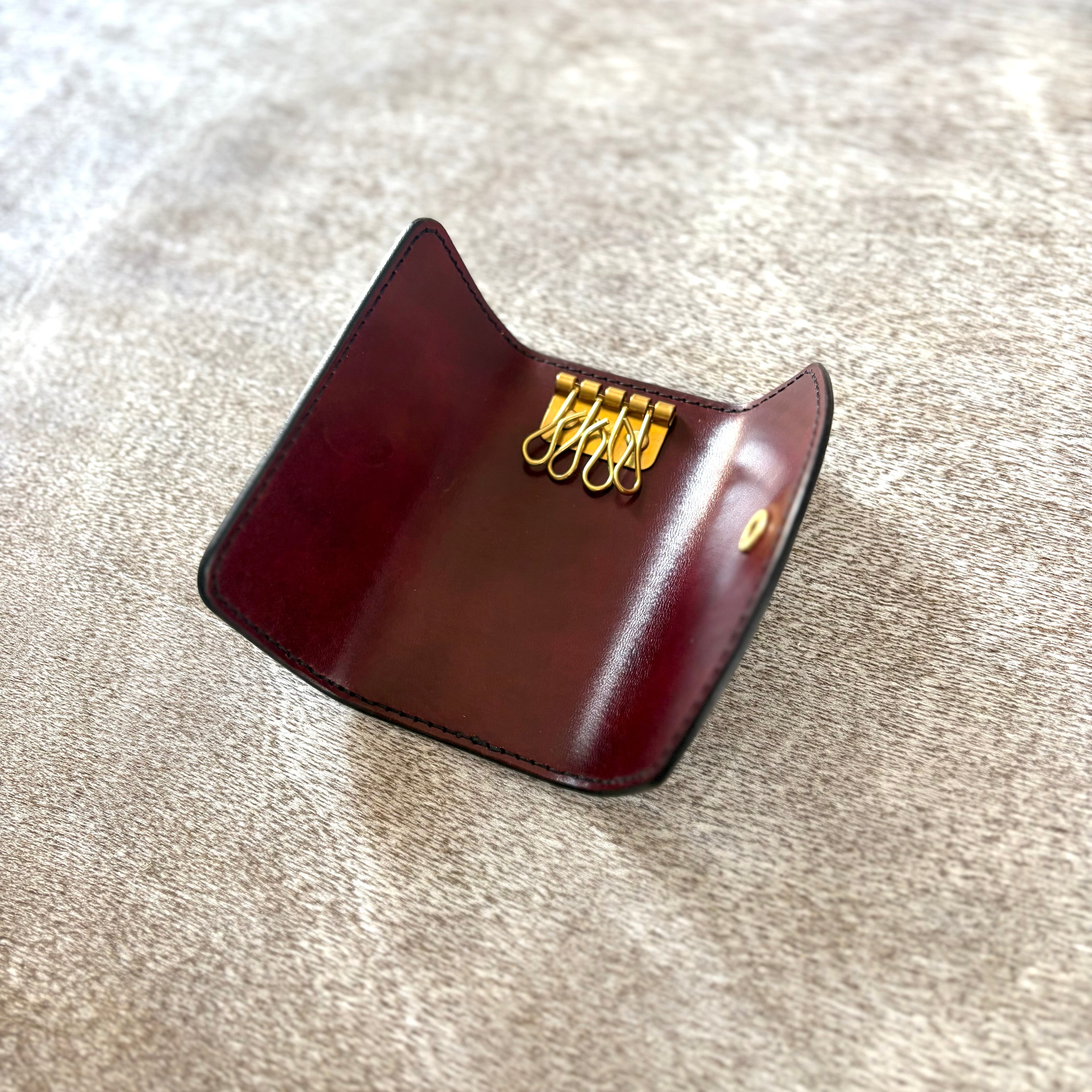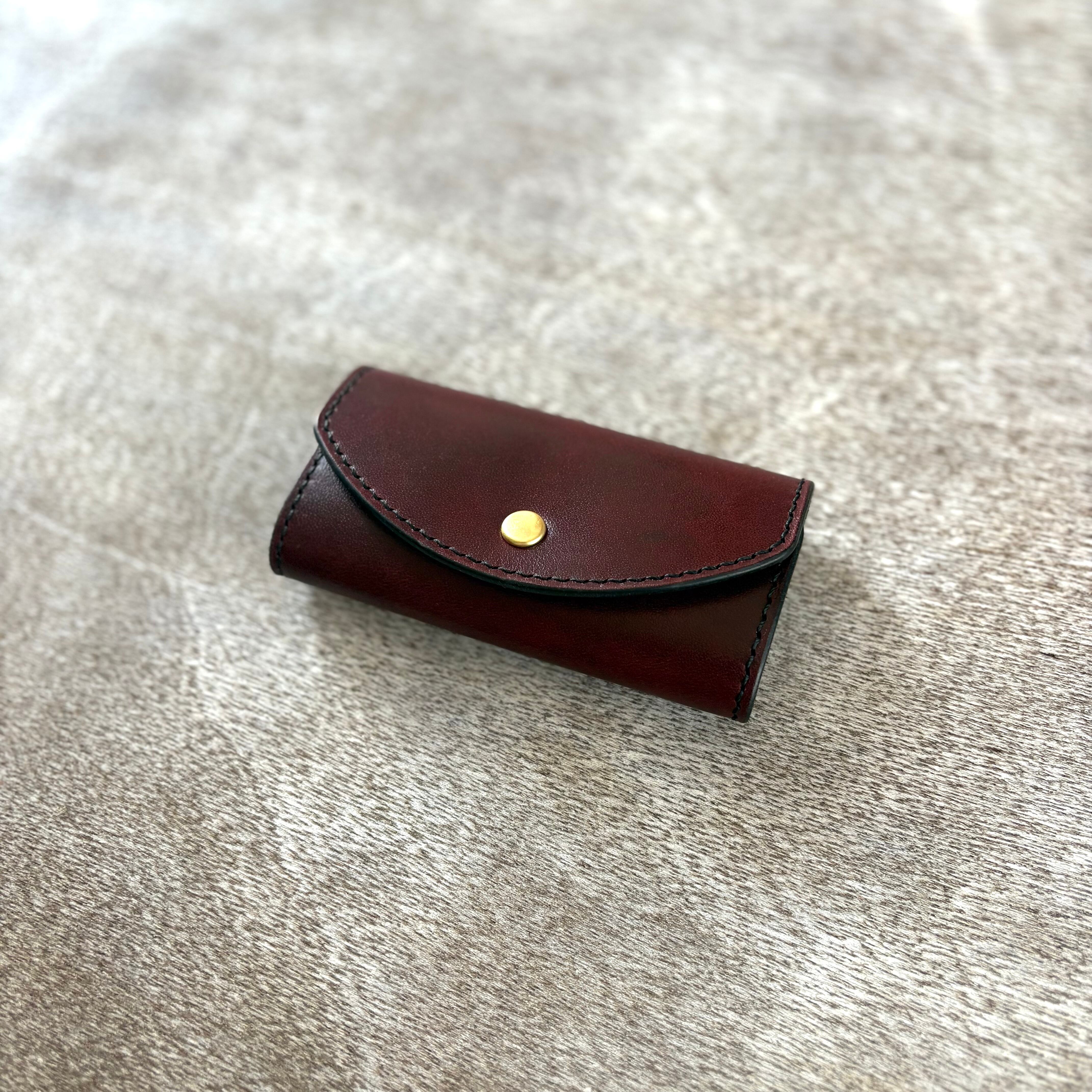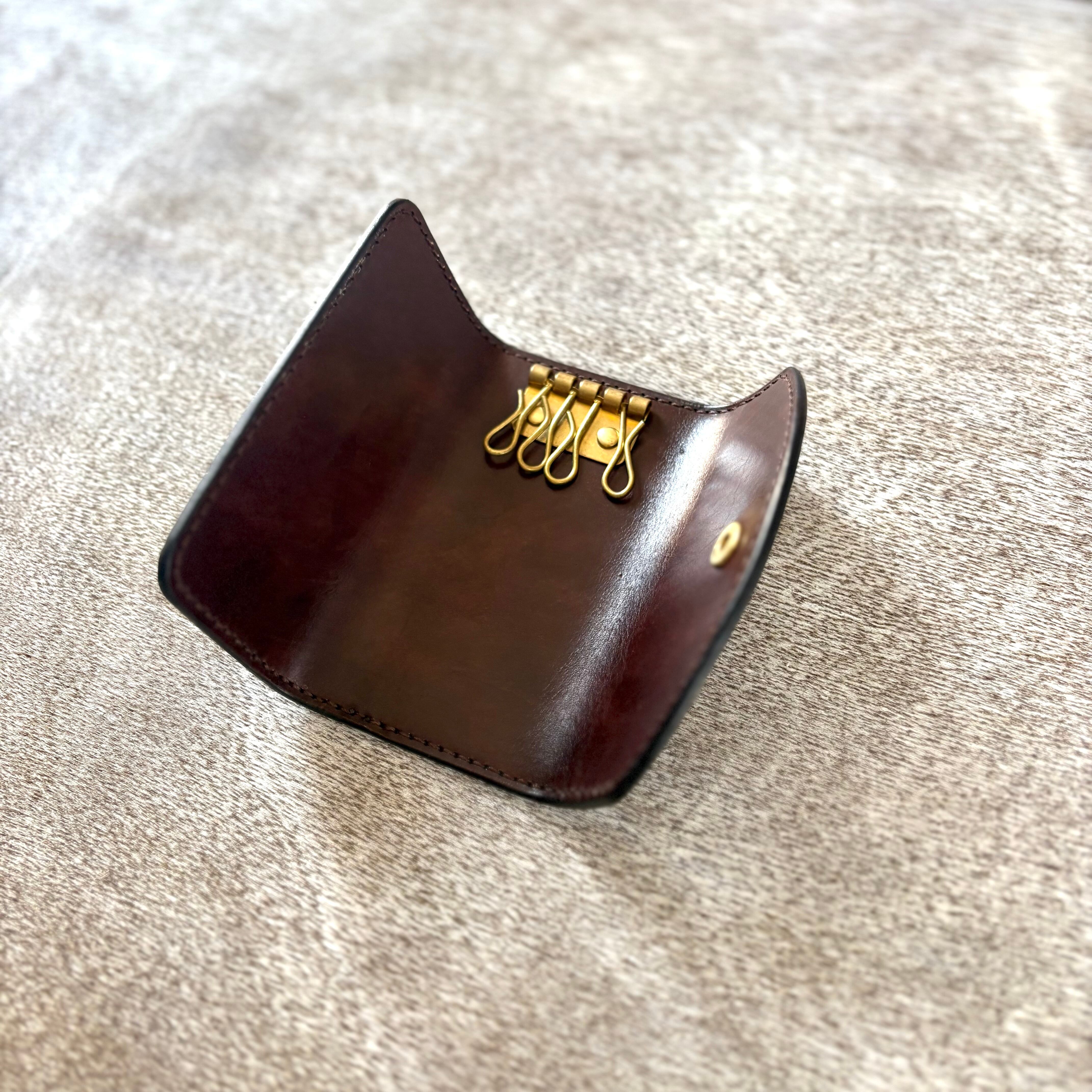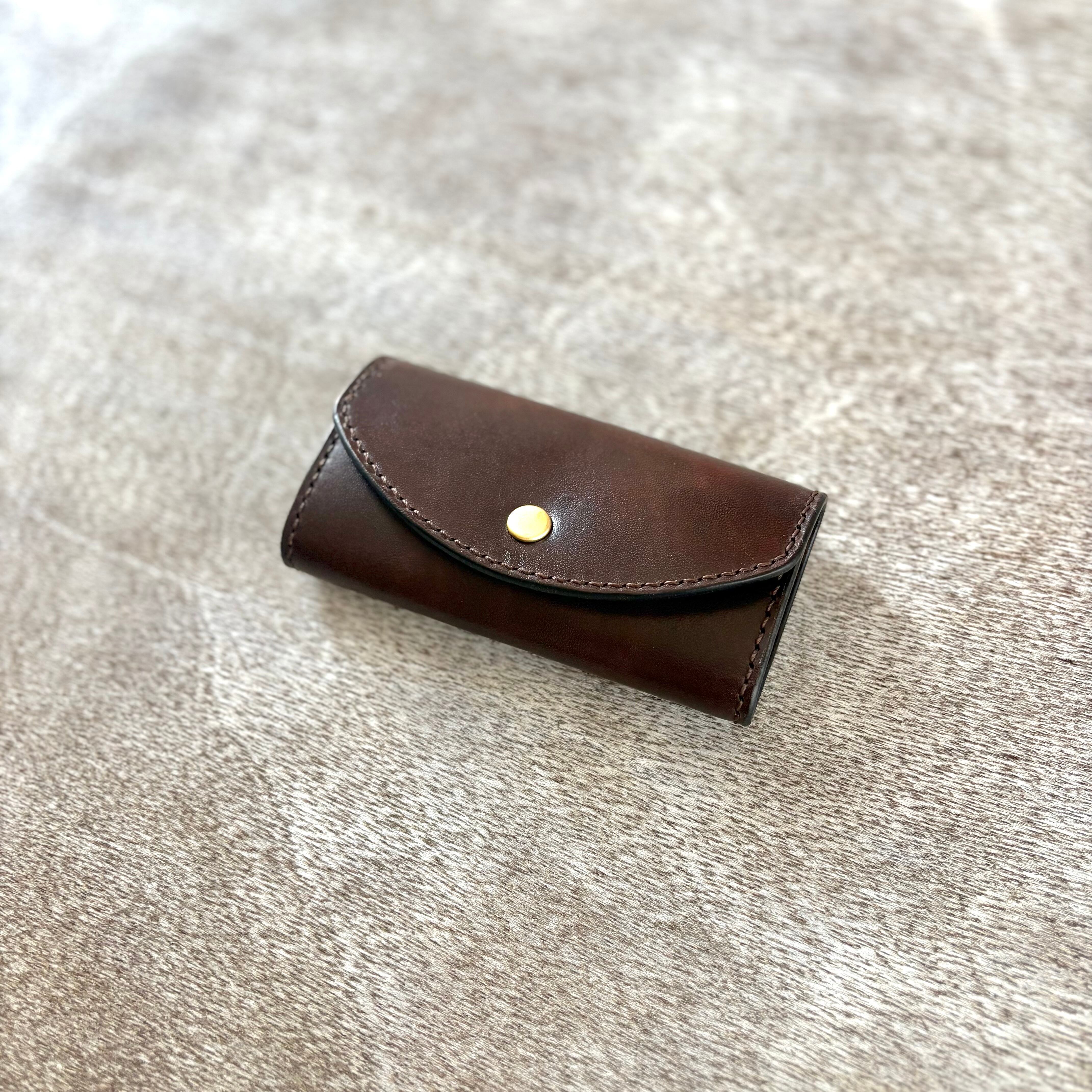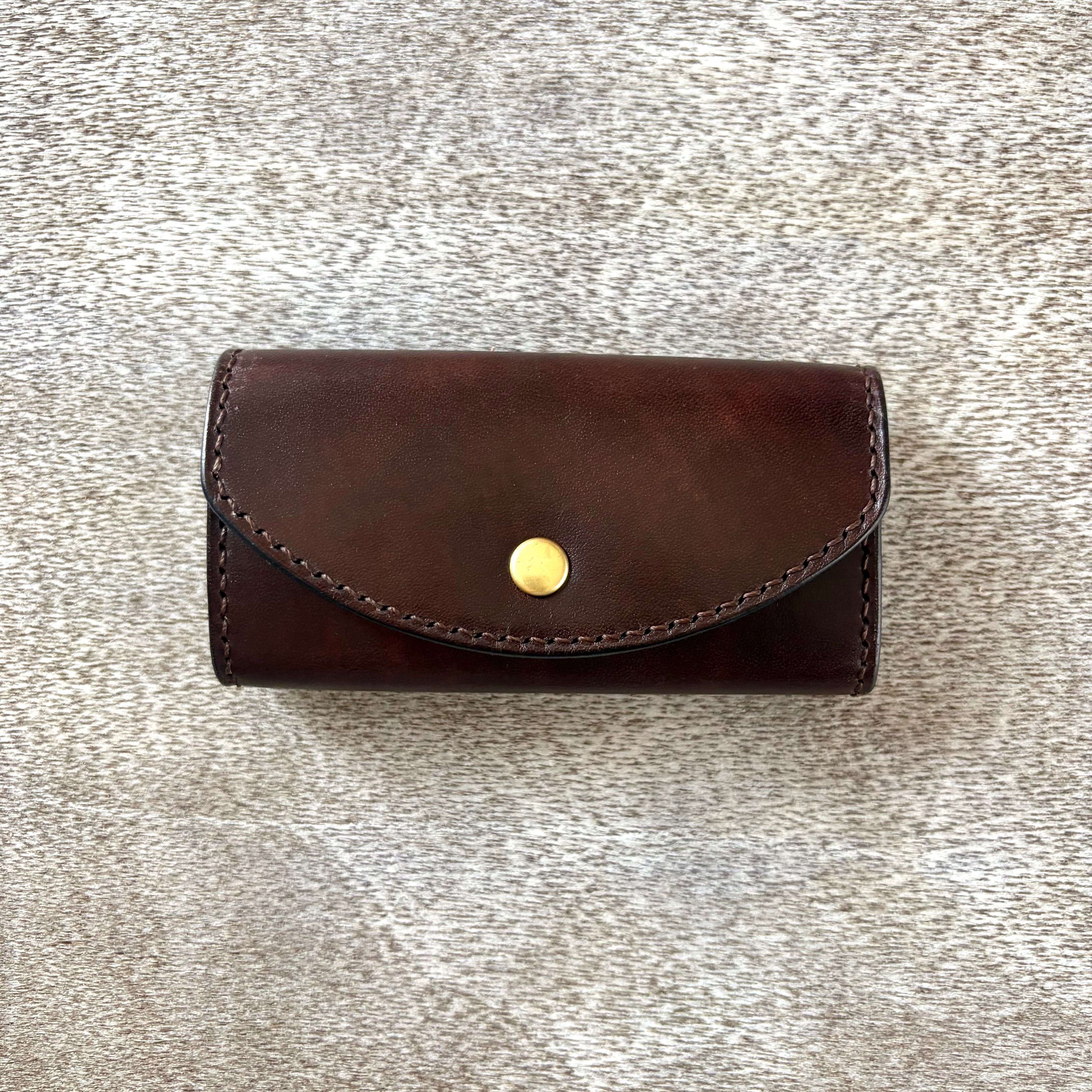 濃淡の効いた、深みのある手染めで仕上げた国産の姫路レザーに、真鍮の金具を合わせ、全て手縫いで仕上げたキーケースです。