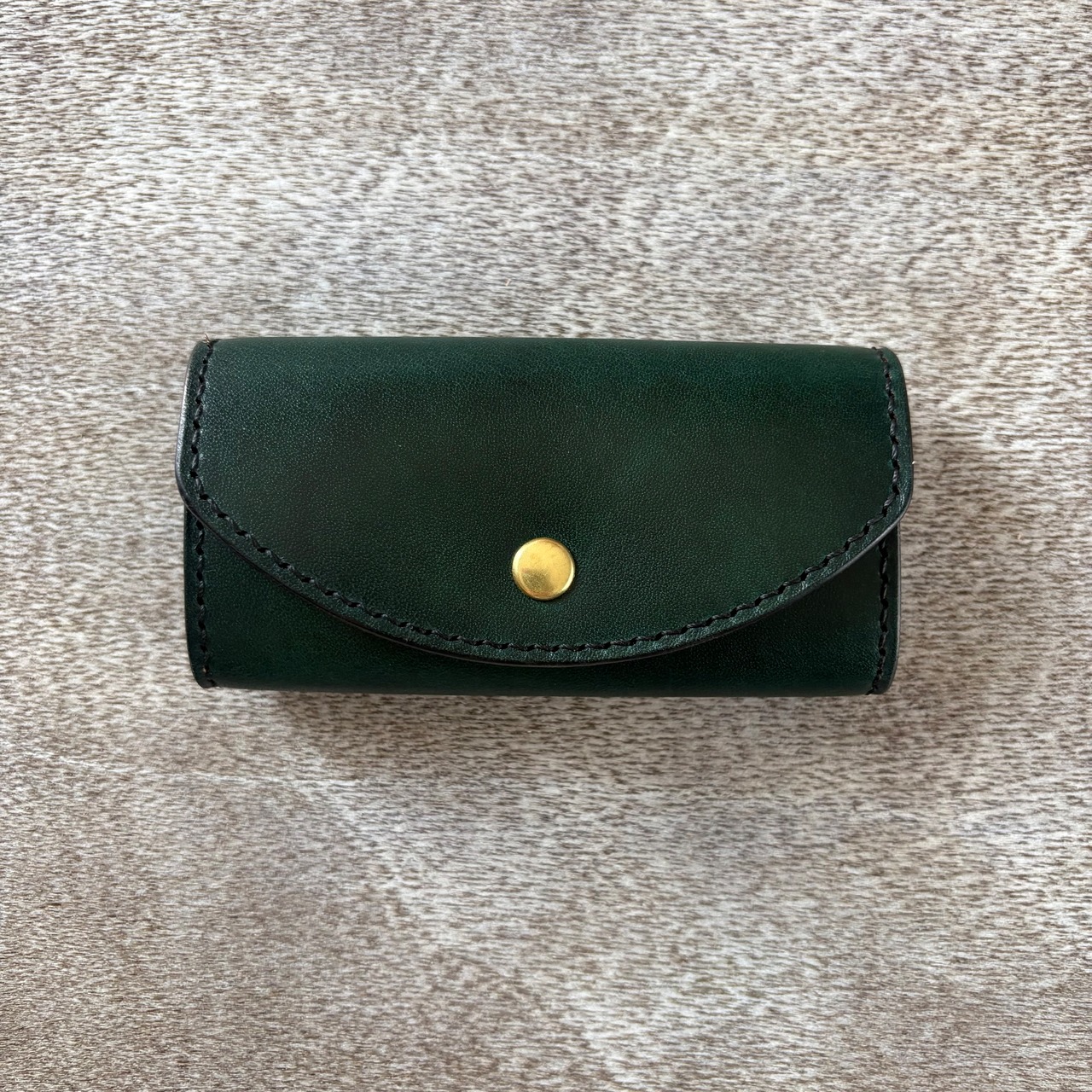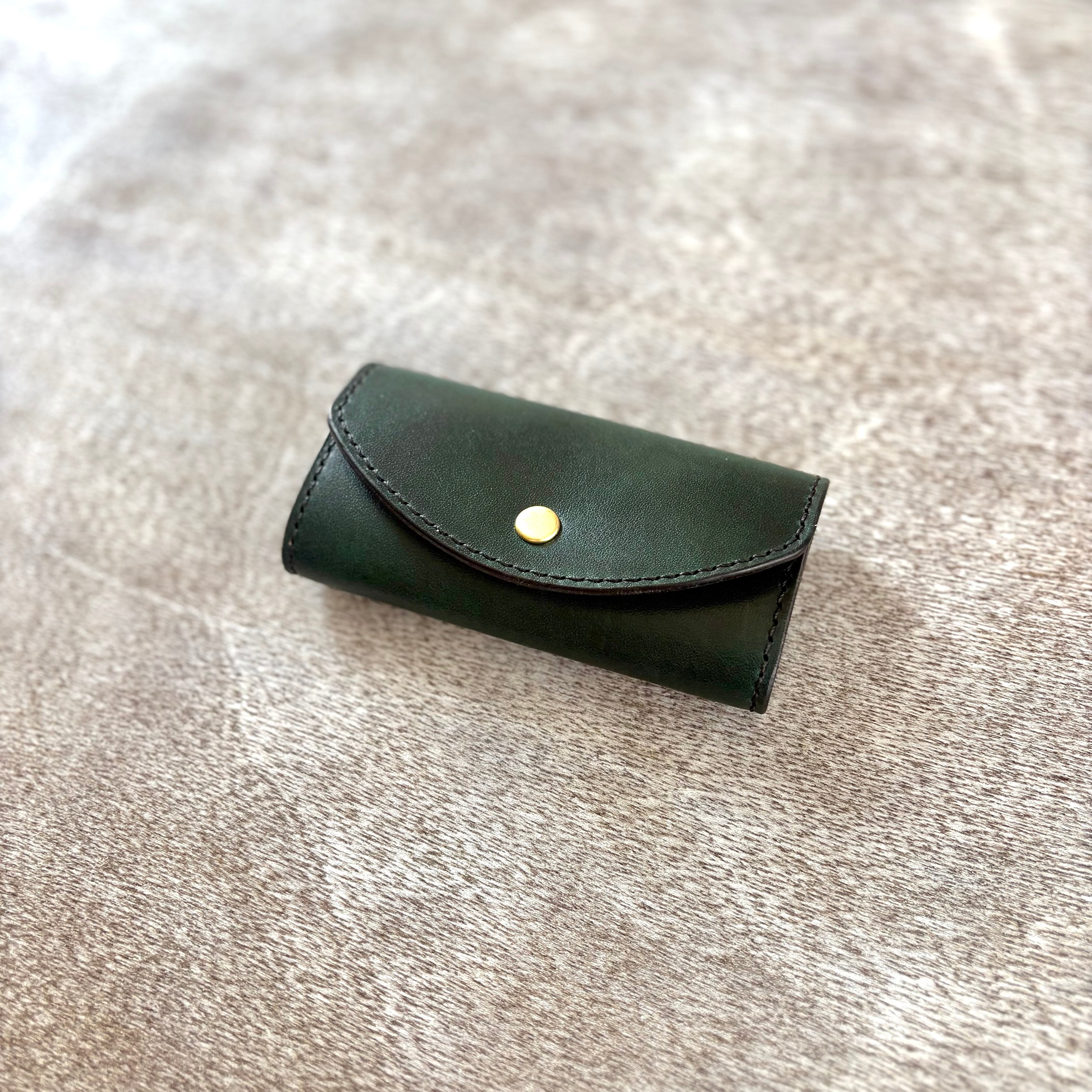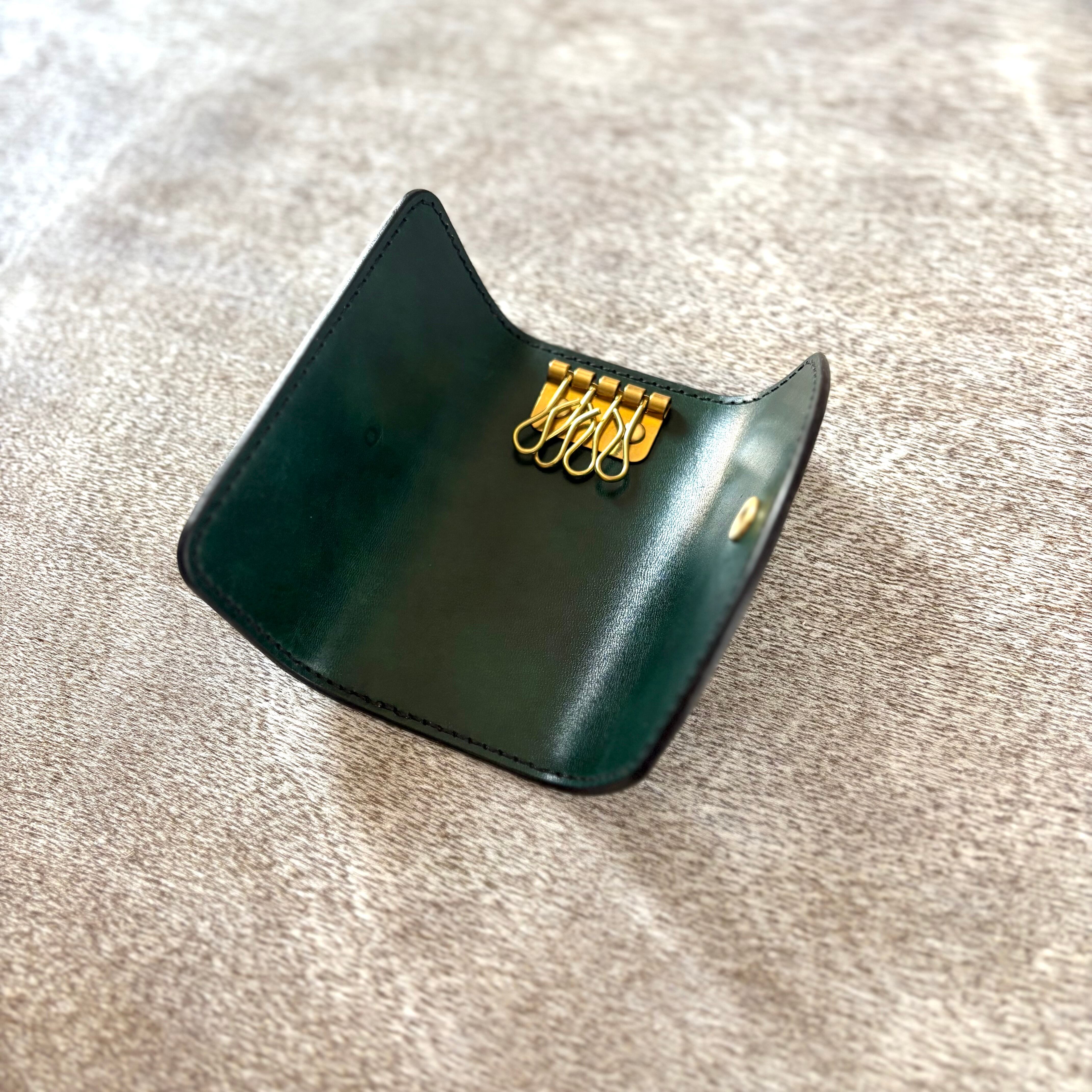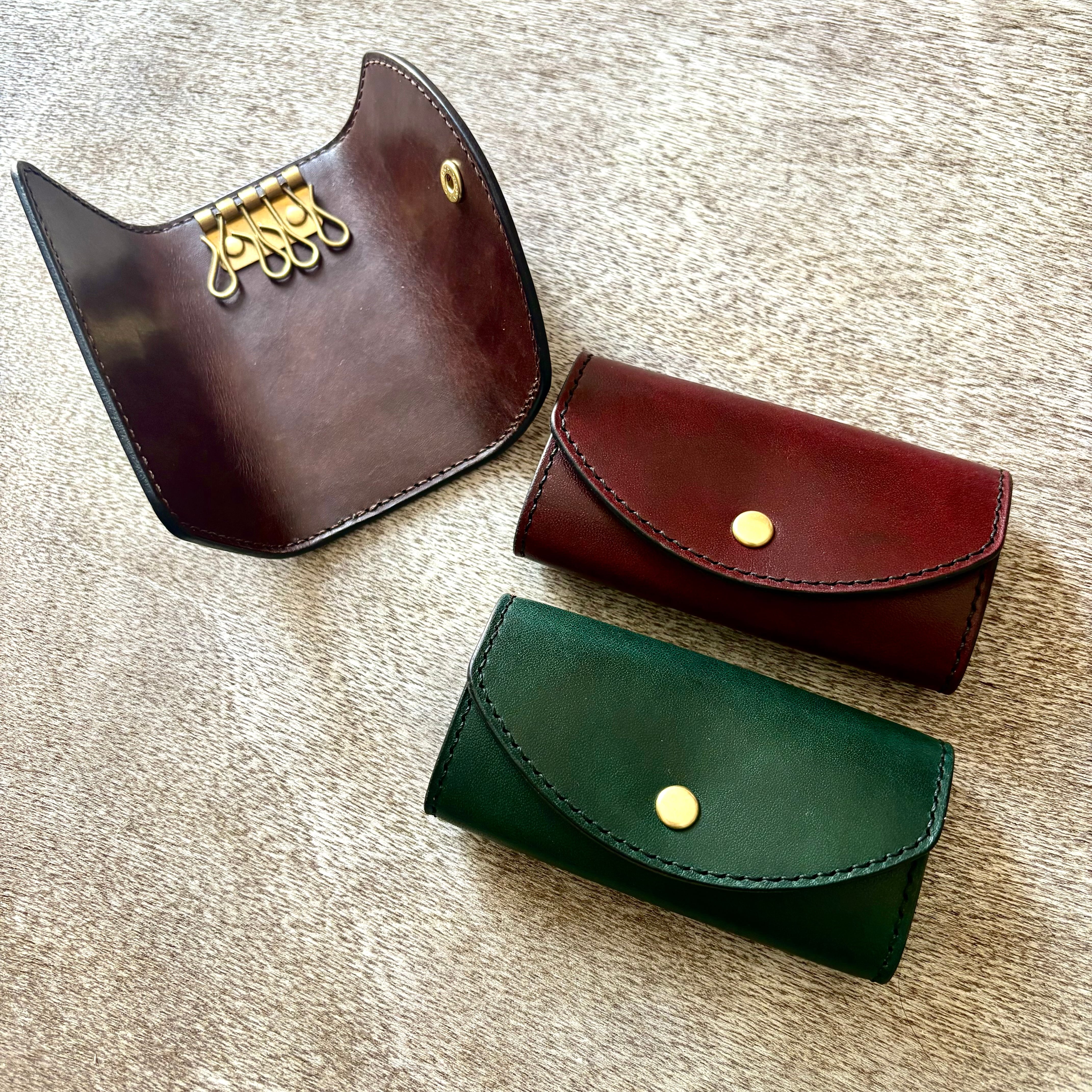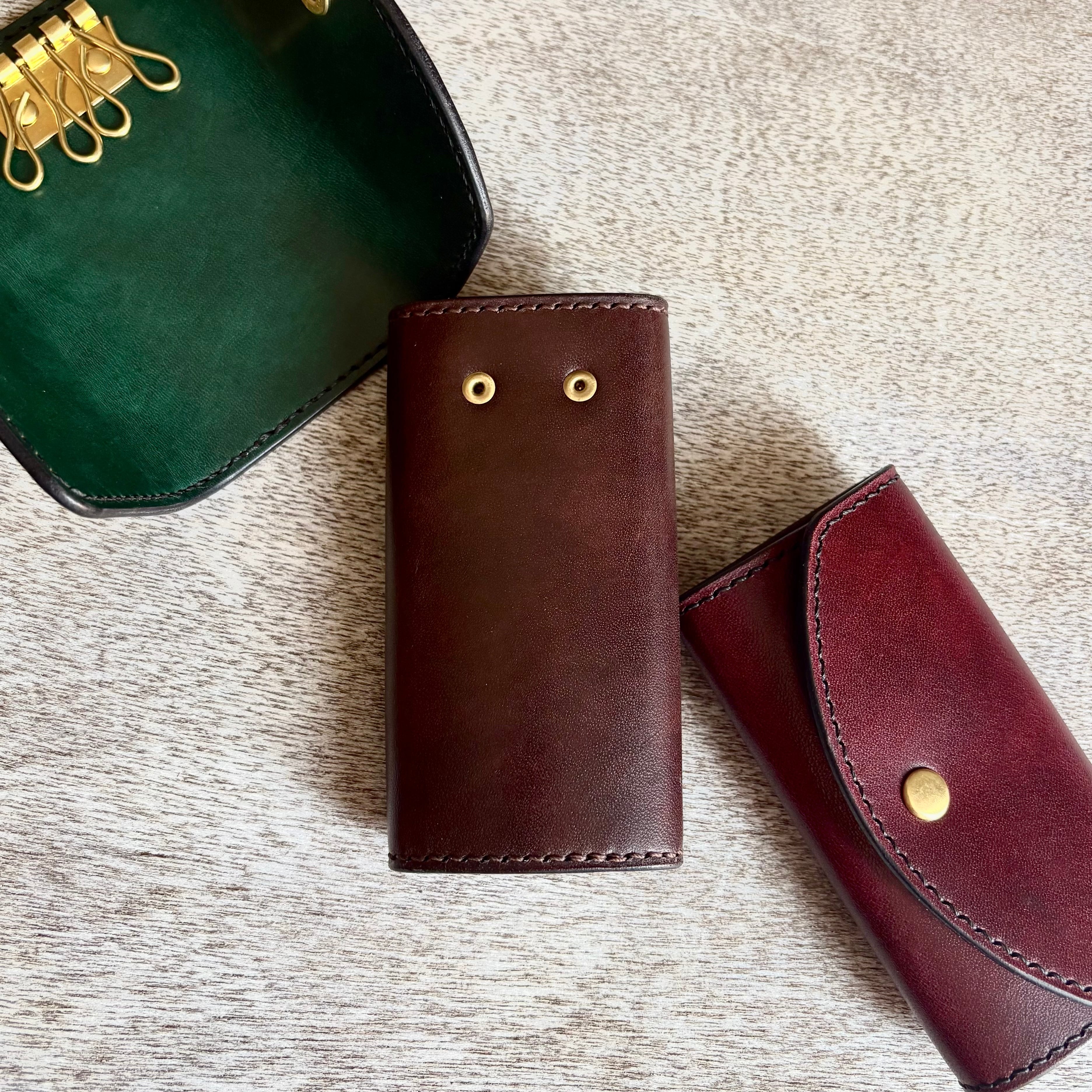 濃淡の効いた、深みのある手染めで仕上げた国産の姫路レザーに、真鍮の金具を合わせ、全て手縫いで仕上げたキーケースです。